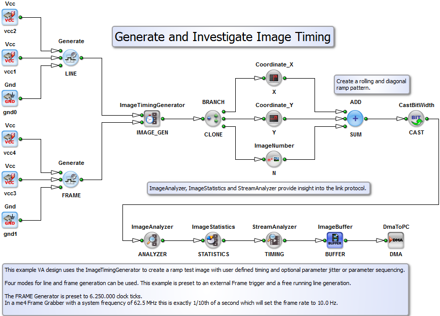 Short Description This example design uses the ImageTimingGenerator to create a ramp test image with user defined timing and optional parameter jitter or parameter sequencing. Four modes for line and frame generation can be used. This example is preset to an external Frame trigger and a free running line generation. |