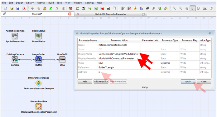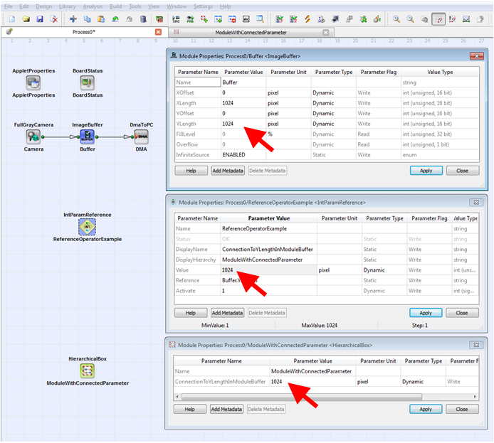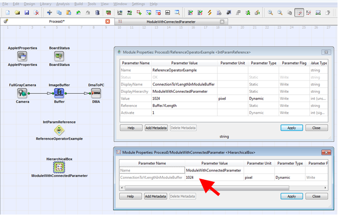 In our example, parameter Value of the reference operator instance is connected to a new parameter ConnectionToYLengthInModuleBuffer of module ModuleWithConnectedParameter :