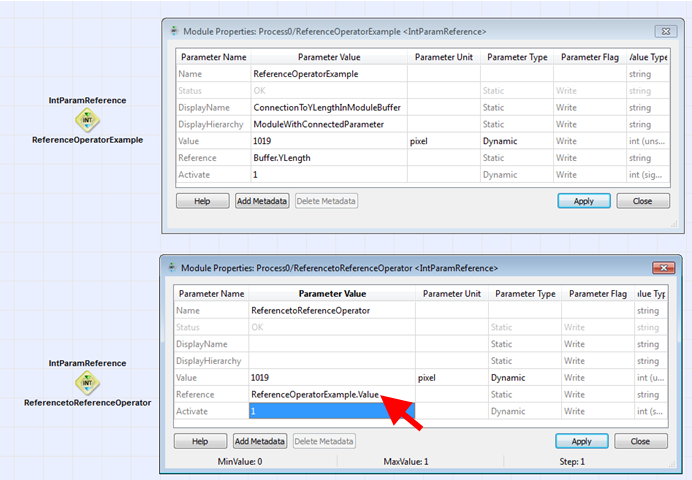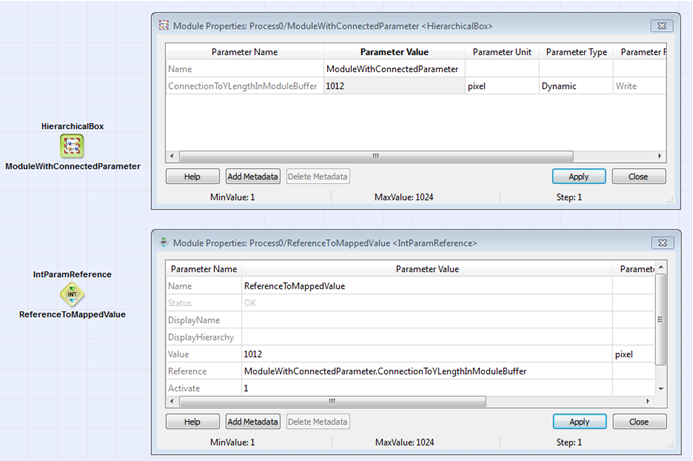 In our example, this means you can reference parameter Value in module ReferenceOperatorExample as well as parameter ConnectionToYLengthInModuleBuffer in module ModuleWithConnectedParameter.