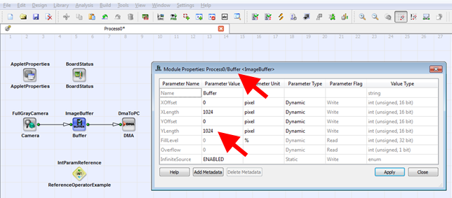 In the example below, an instance of the operator IntParamReference with the name Reference Operator Example connects to the parameter YLength in module Buffer. In this example, both modules (Reference Operator Example and Buffer) are located on the same hierarchical level.