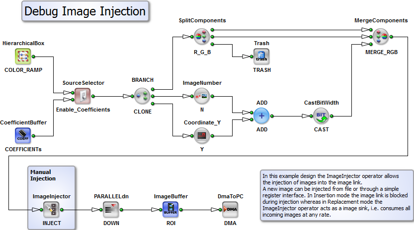 Short Description In this example design the ImageInjector operator allows the injection of images into the image link. A new image can be injected from file or through a simple register interface. In Insertion mode the image link is blocked during injection whereas in Replacement mode the ImageInjector operator acts as a image sink, i.e. consumes all incoming images at any rate. |