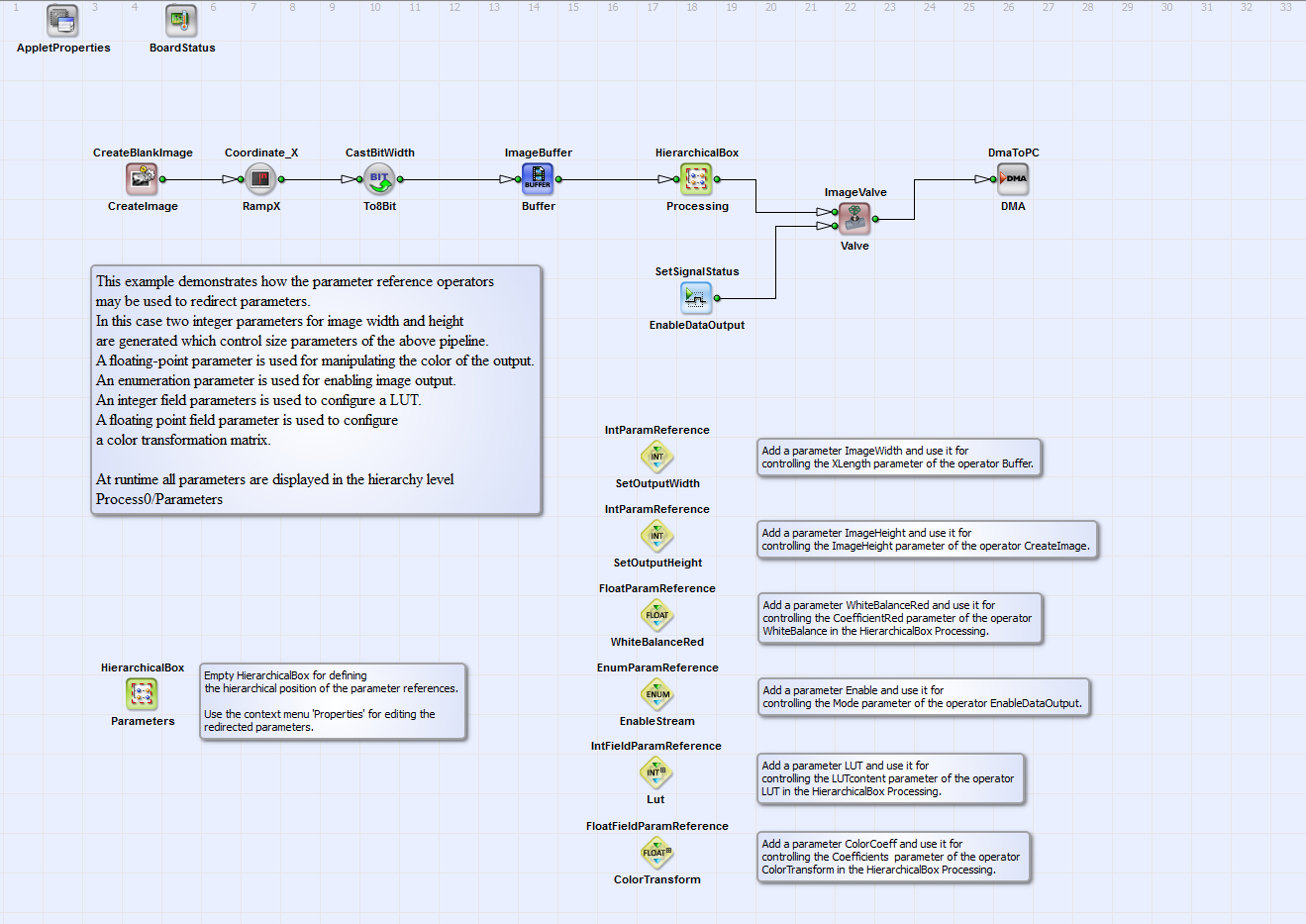 This example demonstrates how the parameter reference operators may be used to redirect parameters. In this case two integer parameters for image width and height are generated which control size parameters of the above pipeline. A floating-point parameter is used for manipulating the color of the output. An enumeration parameter is used for enabling image output. An integer field parameters is used to configure a LUT. A floating point field parameter is used to configure a color transformation matrix. At runtime all parameters are displayed in the hierarchy level Process0/Parameters.