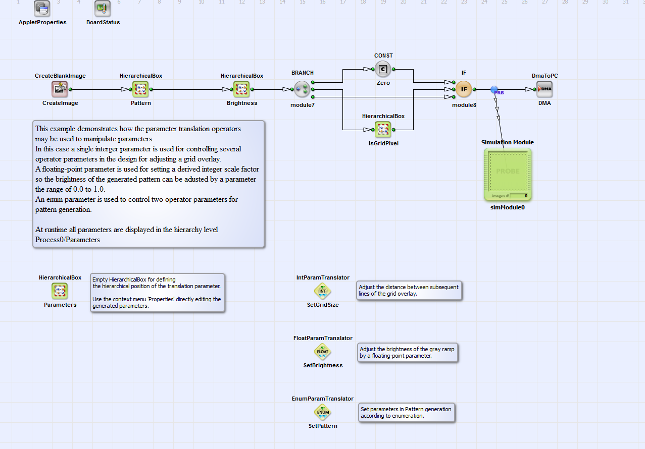 This example demonstrates how the parameter translation operators may be used to manipulate parameters. In this case a single interger parameter is used for controlling several operator parameters in the design for adjusting a grid overlay. A floating-point parameter is used for setting a derived integer scale factor so the brightness of the generated pattern can be adusted by a parameter the range of 0.0 to 1.0. An enum parameter is used to control two operator parameters for pattern generation. At runtime all parameters are displayed in the hierarchy level Process0/Parameters.