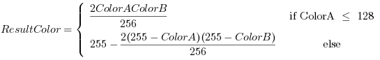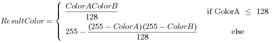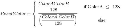 Next, there are some parts in the equation like 255 minus ColorA. This is a simple color inversion. White becomes dark, dark becomes white. An inversion of an value can also be made using a simple inversion of each bit. This allows us to finally rewrite the equation: