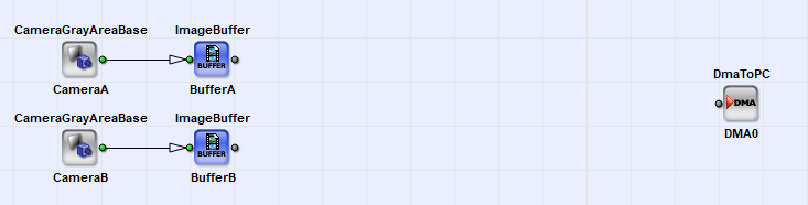 Next we need to synchronize the data streams of both cameras. This can simply be done by using operator SYNC. The SYNC operator controls it's inputs so that the outputs are fully synchronized. As you can see, we used two buffer modules before the synchronization. We need to use them because we cannot ensure that both cameras are 100% synchronous.