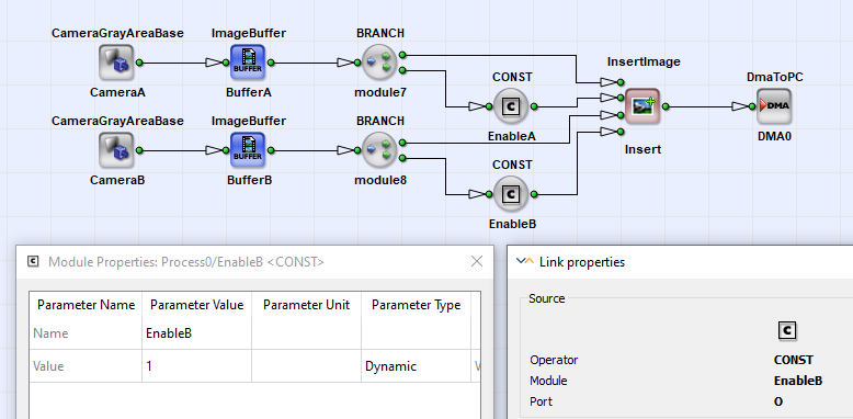As you can see, we placed the image buffer modules before the insertion. This is because the InsertImage operator has no buffer itself. While images of input 0 are forwarded, input one is blocked, thus camera images need to be buffered to avoid the loss of data.