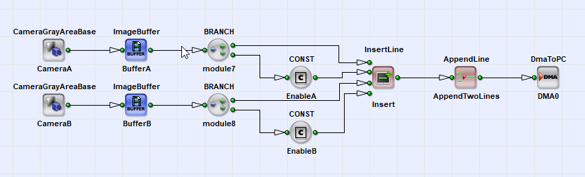 In the previous section we multiplexed two cameras images. Stitching is almost done in the same way. We use operator InsertLine instead and need to append two successive lines using an AppendLine operator.