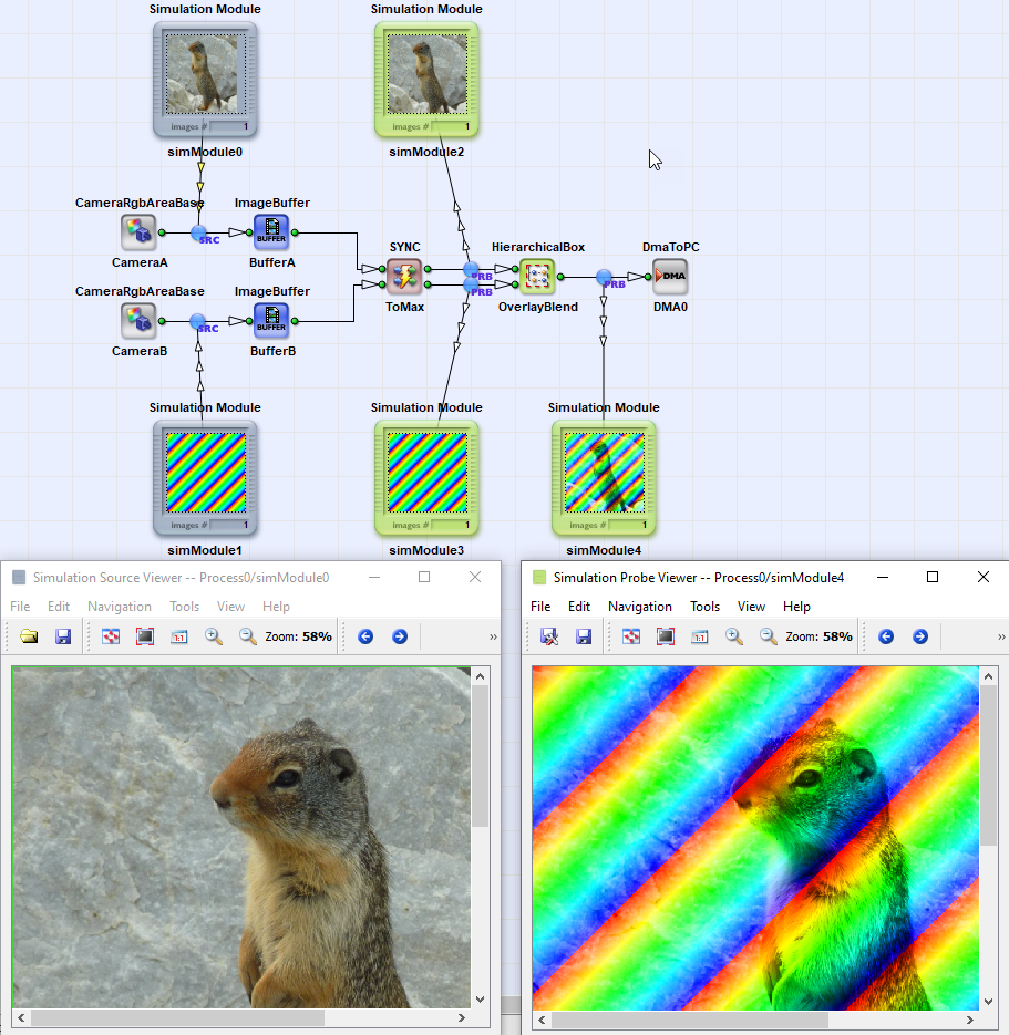 We can easily verify the functionality of our overflow-blend using the VisualApplets simulation. Use two simulation sources to inject an image for both cameras. Place simulation probes to any link you like. The simulation results will show you the overlay of both images. If interested, you can also check the intermediate results of the overlay in the hierarchical boxes.