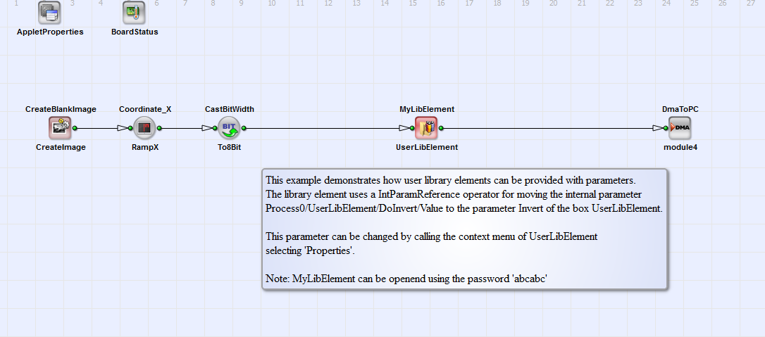 This example demonstrates how user library elements can be provided with parameters. The library element uses a IntParamReference operator for moving the internal parameter Process0/UserLibElement/DoInvert/Value to the parameter Invert of the box UserLibElement. This parameter can be changed by calling the context menu of UserLibElement selecting 'Properties'. Note: MyLibElement can be openend using the password 'abcabc'.