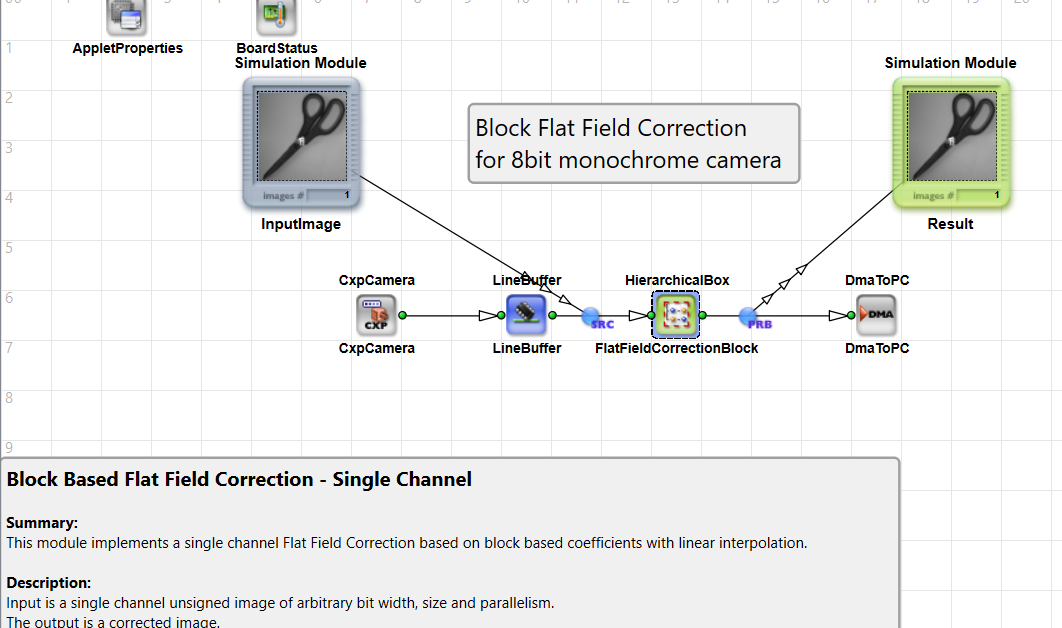 The examples show the implementation of a block Flat Field Correction. Correction values are stored in Luts and do not require DRAM resources. The applets perform a high precision offset and gain correction.